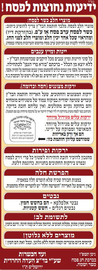 ועד הכשרות מטעם הבד”ץ: ידיעות נחוצות לפסח תשפ”ו March 29, 2026 – י״א בניסן תשפ״ו by HyehudiSome other articles:אזהרת והדרכת ועד הכשרות שע”י בד”ץ העד”ח: בדיקת חרקים בשבולת שועלעלון ‘ההשגחה’ כסלו – שע”י ועד הכשרות של בד”ץ העדההוראות ועד הכשרות לפירות ט”ו בשבטחינם: לוח ידיעות נחוצות לבעלי דיןגליון ההכשר גליון ג’ – מבית ועד הכשרות בד”ץ העד”חPowered by YARPP.